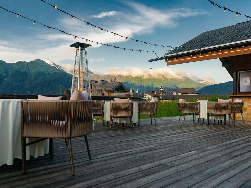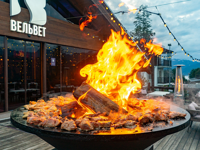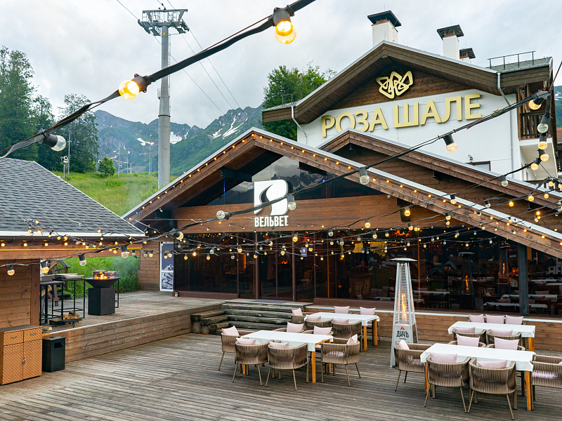 Главной уникальностью ресторана «Вельвет» стала терраса, которая находится на высоте 1100 метров над уровнем моря. На веранде гости могут насладиться видами на горы и любоваться красочными закатами.