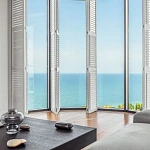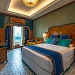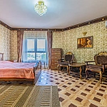 Главной особенностью этой квартиры является огромная кровать, которая установлена прямо у панорамного окна, вместо привычной стены, с видом на море и парковую зону санатория.