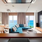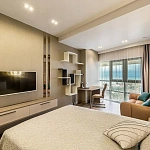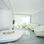 Фасады его изобилируют стеклянными элементами, а сине-белая цветовая гамма символизирует уникальные природно-климатические условия Сочи – теплое ласковое море и заснеженные горные вершины!