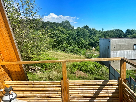 Закрытая территория домом из сруба большая терраса и балкон парковочные места.