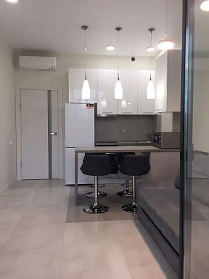 Общая площадь этой квартиры – 55 м2. Ее пространство распланировано на 2 комнаты: изолированную спальню и гостиную с кухонной зоной. Есть открытый балкон, с которого открывается прекрасный вид на парк «Дендрарий» и морскую акваторию.