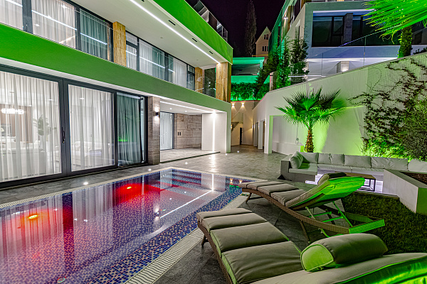 Площадь дома составляет 425 кв.м. Рациональная планировка: 5 уютные светлые комнаты, которые можно использовать исходя из своих предпочтений, просторная кухня-гостиная с выходом к зоне отдыха, 4 санузла и балкон с великолепным видом на горные вершины, море и лесной массив.