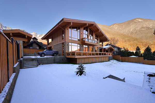 Хочется обратить особое внимание на великолепные пейзажи гор Аибги и Ачишхо, открывающиеся из панорамных окон шале. Площадь основного дома без учета террас составляет 600 кв.м.