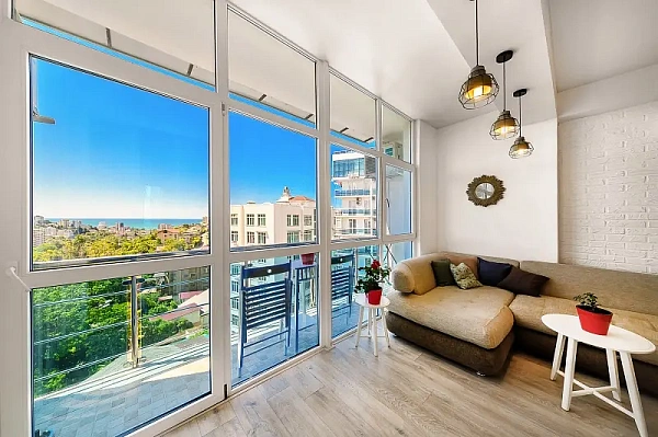 Квартира с напорамными окнами, большим открытым балконом, великолепным видом на город, горы и море.
