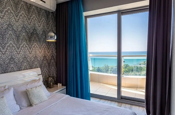 В квартире выполнен хороший ремонт, распланирована квартира в просторную кухню гостиную, изолированная спальная комната с гардеробной, большая терраса с шикарным видом на море и внутренний двор с бассейном, совмещённый санузел, из всех комнат есть свой выход на террасу. Все комнаты укомплектованы мебелью и техникой.