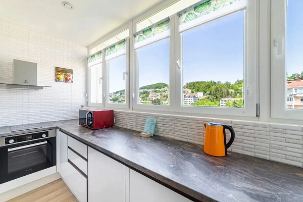 Продается квартира с новым дизайнерским ремонтом с общей площадью 100м2, просторная кухня гостиная укомплектованная мебелью и техникой, две большие изолированный комнаты укомплектованные полностью мебелью, два санузла, большой коридор, три балкона с видом на море. По всей квартире теплый пол, центральные коммуникации.