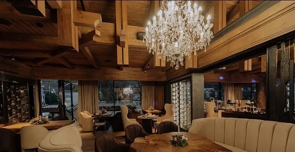 На втором этаже:бар,основной зал для гостей,открытая терраса,кабинет для переговоров,Vip-комната.Посадка в основном зале 180 мест.Оба этажа оснащены каминами.Башня VIP-комната.