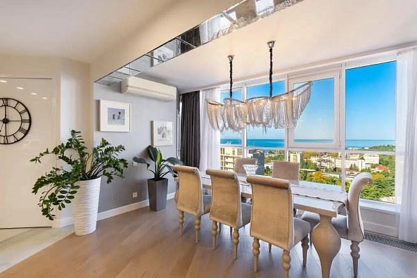 В квартире очень светло и просторно, панорамные окна в пол с прекрасным видом на море. Все коммуникации центральные.