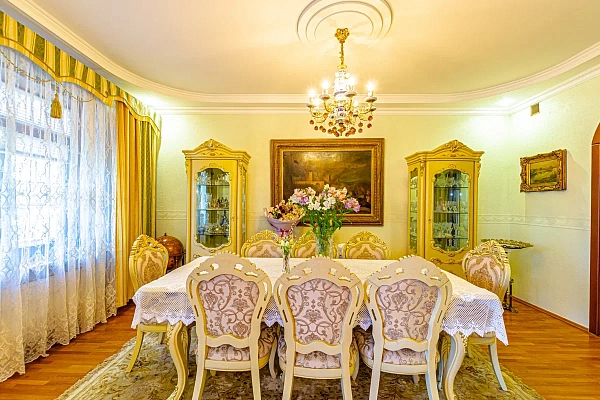 На трех этажах разместились 2 гостиные, 3 спальни, 2 санузла, сауна, джакузи. Выполнен качественный ремонт в классическом стиле с использованием натуральных материалов. Вся мебель и техника остается новым владельцам дома.