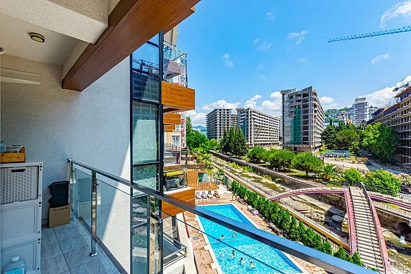 В 50 метрах от комплекса расположена прогулочная набережная реки Псахе, выйти на которую можно с придомовой территории. А также автобусная остановка, продуктовый рынок и магазины. Дорога к морю займет 2-5 минут по благоустроенной набережной.