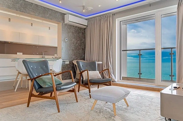 В квартире новый ремонт, выполнен из премиальных материалов. Большой балкон с зоной отдыха и шикарным видом на море.