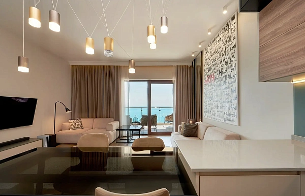 В новом комплексе бизнес-класса продается трехкомнатная квартира с новым дизайнерским ремонтом. Квартира с панорамными окнами, из которых открывается невероятный вид на город и море. Квартира спланирована в просторную кухню-гостиную, спальню, детскую комнату и два санузла. Из гостиной выход на балкон.