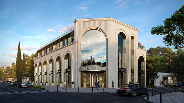 Архитектура здания имеет стилизацию под АРТДЕКО. Использование дорогих материалов, металла и натурального камня. Арки, обрамлённые листовым металлом. Тонированные стекла с золотым отливом.