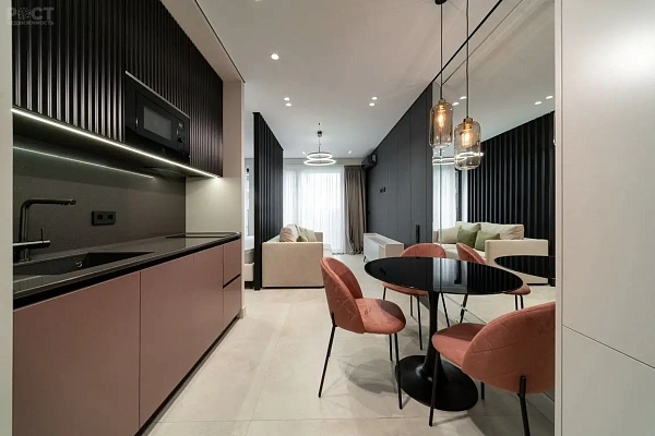 Планировка спальня и просторная кухня-гостиная, для комфортного время препровождения в кругу самых близких.