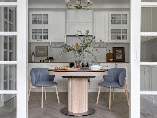 Современная мебель в интерьере разбавляет классический стиль, придавая ему свежий и современный вид. Стеклянные двери обеспечивают доступ естественного света в самые отдаленные уголки квартиры, создавая ощущение простора и света.