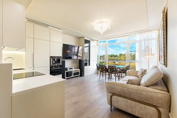 Потрясающая квартира с дизайнерским ремонтом, дорогой мебелью и техникой. Площадь 110 м2 распланирована в две изолированные спальные комнаты, кухню-гостиную, гардеробную, два с/у.