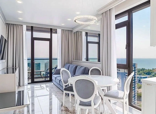 В квартире сделан новый ремонт, стилистика минимализм в белых оттенках. Панорамное остекление (со специальным напылением, что не позволяет полноценно в жаркие дни проникать солнцу в квартиру и не делает ее жаркой) позволяет любоваться потрясающими видами как на море, так и на Дендрарий наполненный разнообразными растениями.