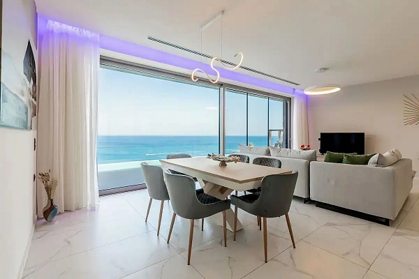 В апартаменте есть своя большая терраса, на которую можно выйти из каждой комнаты. Планировка: большая кухня гостиная с террасой и потрясающим, панорамным видом на море, две изолированные спальни, также с выходом на море, два сан узла.