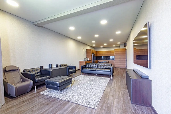 Квартира площадью 160 кв. м. распланирована в огромную кухню-гостиную, две спальни, два сан. узла. Выполнен дизайнерский ремонт, установлена премиальная техника.