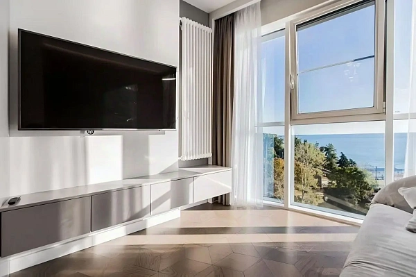 В квартире сделан новый ремонт, с балкона открывается панорамный вид на море. Планировка: изолированная спальня, большая кухня-гостиная, просторный санузел, гардеробная.