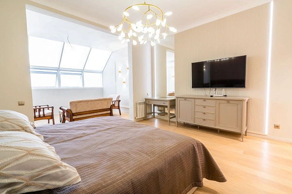 Просторная планировка: спальня, кабинет, большая кухня-гостиная.