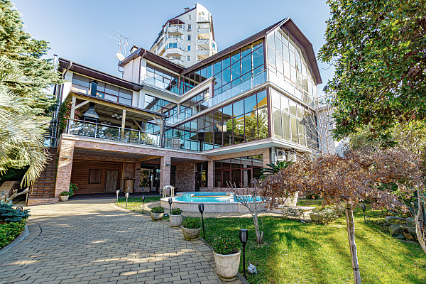 В доме предусмотрены помещения для хозяев, гостей и обслуживающего персонала. Земельный участок площадью 11 соток на котором расположен бассейн, гараж для автомобилей, гостевая парковка. Так же есть банный комплекс, бильярдная, зоны отдыха и барбекю. Отдельной похвалы заслуживают обустроенные террасы, позволяющие наслаждаться красотами моря.