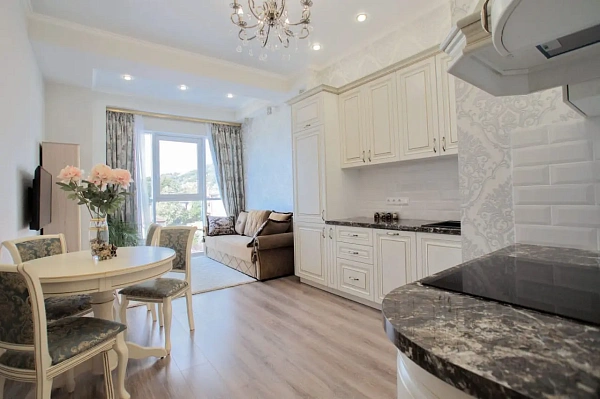 Видовая квартира в жк Посейдон. Новый дизайнерский ремонт. Дорогая мебель и техника. Никто не жил. Первая береговая линия.Кухня-гостиная, спальня, гардеробная.