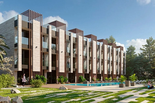 Фасад комплекса отделывается премиальными материалами, молодой травертин и элементы дерева используются по всему комплексу. Помещения общего пользования также делаются из керамогранита и гранита.
