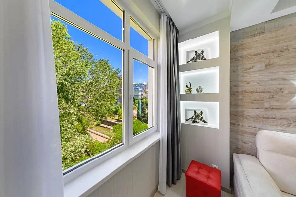 Из окон квартиры открывается просторный вид на горы, речку и зелень.