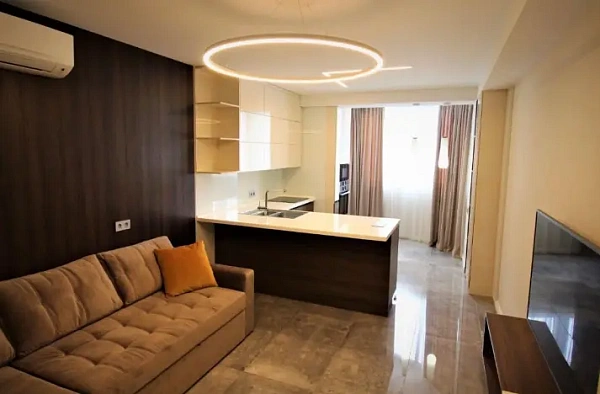 Продам квартиру в центре Сочи, с новым дизайнерским ремонтом и видом на море! Распланирована в 2 спальные комнаты, кухню-гостиную, совмещенный санузел, гардероб.