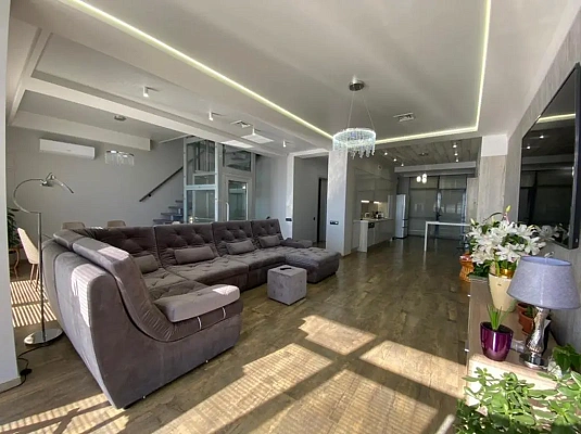 4 спальни , 5 санузлов с сауной , джакузи , ваннами . Зал - гостиная - кухня 80 м , 3 балкона , немецкая система вентиляции , гараж , котельная , терраса 100 м на крыше