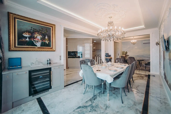 На первом этаже пентхауса расположены две просторные и светлые спальные комнаты с санузлами и функциональной гардеробной. А на втором этаже просторная кухня с обеденной зоной, гостиная и две спальни с собственными санузлами. Из каждой комнаты есть выход на террасу с потрясающими видами на море, концертный зал, морской порт, зимний театр и главную набережную города Сочи. Пентхаус расположен в самом центре города в 400 м. до оборудованных пляжей и всей социальной и коммерческой инфраструктуры.