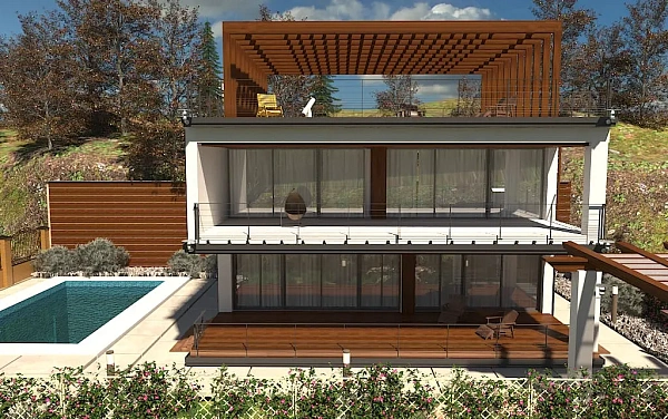 Новый коттеджный поселок расположился в окружении национального парка. Все дома в стиле хай тек, двухэтажные с эксплуатируемой кровлей, с панорамным видом на горы.