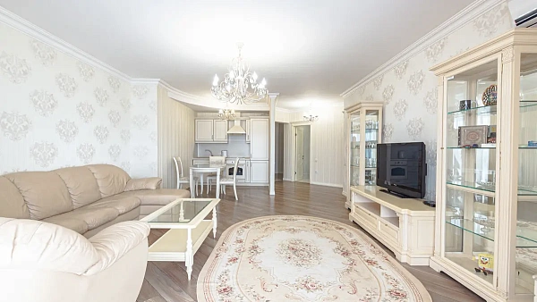 Пространство распланировано в просторную гостиную комнату объединённую с кухней, большую спальную комнату, и объединённый санузел. При входе сделана просторная гардеробная. В квартире установлены панорамные окна от потолка до пола, благодаря которым Вы будете наслаждаться видам на море и город.