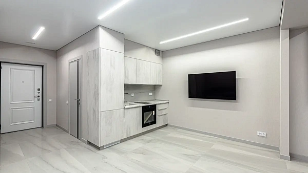 Квартира оснащена встроенной и мягкой мебелью, а также техникой.