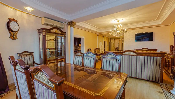 Все комнаты обставлены итальянской мебелью из массива дерева. Подогрев пола. Кухня оборудована высококачественной немецкой бытовой техникой. Квартира оформлена в едином классическом стиле. Хрустальные люстры и интересные световые решения. В интерьере присутствуют элементы лепнины.