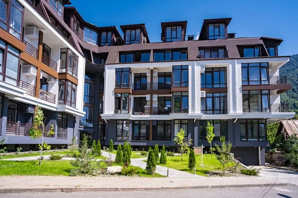 Дом выполнен в стиле Шале. Жилой дом. Статус-квартира. Квартиры свободной планировки.Тихое, наполненное природой место в центре Красной Поляны с отличным видом на горные массивы. Рядом находятся вся инфраструктура: школа, детский сад, стадион, больница, стадион, парк для прогулок. Отличные дороги.Остановка в 200 метрах, рядом ж/д вокзал с "Ласточками"