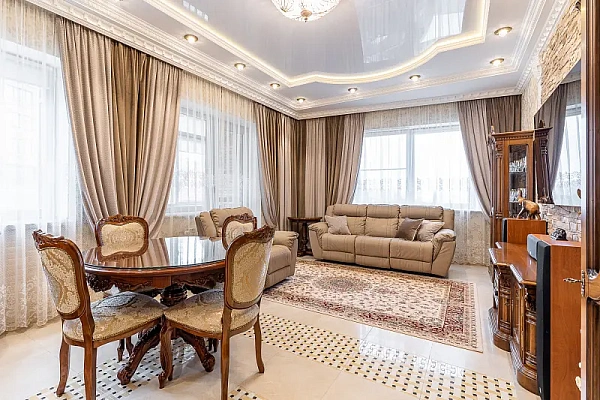 Шикарная квартира с дизайнерским ремонтом, дорогой мебелью и техникой. Площадь 120 м2 распланирована в три изолированные комнаты, кухню-гостиную, гардеробную, два с/у.
