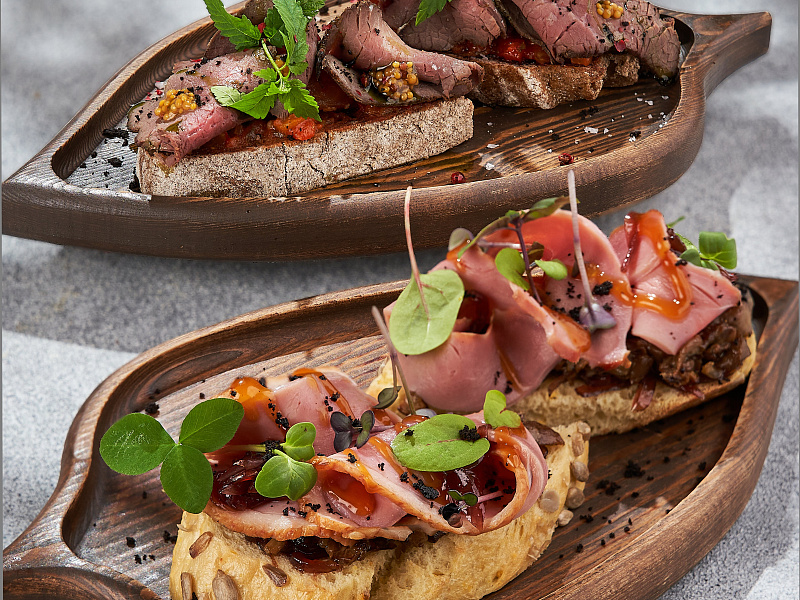 Мы готовим из всего, что было добыто на охоте и рыбалке. В программе – блюда из мяса лося, северного оленя, дикого кабана, зайца, дикой перепелки, утки, косули, цесарки, бобра. Для ценителей рыбы и морепродуктов – устрицы, гребешки, краб, морские ежи из аквариума, а также волжский судак в сливочном соусе, строганов из рапанов и многое другое.