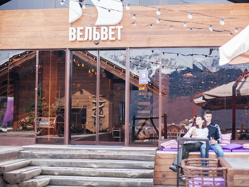 Главной уникальностью ресторана «Вельвет» стала терраса, которая находится на высоте 1100 метров над уровнем моря. На веранде гости могут насладиться видами на горы и любоваться красочными закатами.