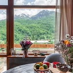 Благодаря большим витражным окнам, из каждого апартамента открывается потрясающий вид на горы.