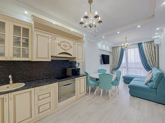 Продам квартиру площадью 55 м2, распланирована в одну изолированную комнату, кухню-гостиную, гардеробную. В квартире выполнен дизайнерский ремонт, установлена брендовая мебель и техника.