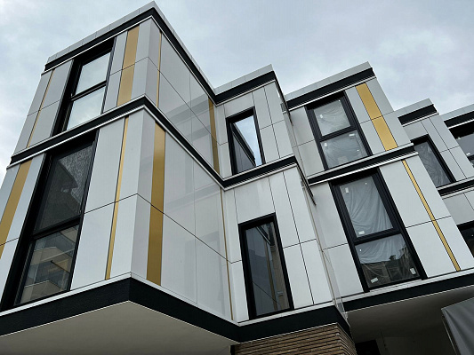 Таунхаус бизнес-класса. 3 жилых этажа площадью 137 м2 + террасы на 1 и 3 этажах + эксплуатируемая кровля ! В общей сложности площадь составляет больше 200 м2. Потолки высотой 3,40 метра. Центральные коммуникации, есть газ (все коммуникации также выведены на террасы). Черновая отделка. Вид на море.