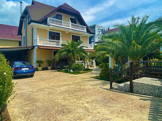 Закрытая территория, ландшафтный дизайн (пальмы, туи, озеленение), большая закрытая летняя терраса с кухонной зоной, телевидением, декоративный фонтан в виде кувшинов, парковочное место на шесть автомобилей.