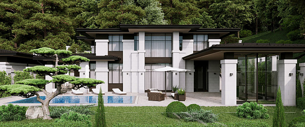 Дом находится в коттеджном поселке, который расположился у подножья горных хребтов на земельном участке с прямым видом на озера с одной стороны и заснеженные вершины с другой. Архитектурный код поселка проповедует стандарты выдержанного премиум-класса, сочетая в себе высокотехнологичные строительные решения и экстерьерный минимализм. Концептуальной особенностью проекта является его географическая приватность и природная ориентированность. Идеальная трасса ведёт от посёлка к горно-лыжным комплексам зимой и к морским-оздоровительным центрам летом.