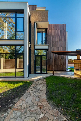 Фасад дома выполнен из комбинированного керамогранита и мраморной крошки, окна из алюминиевого профиля фирмы Алюмил