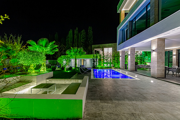 На земельном участке площадью 8 соток расположен бассейн, парковка для автомобилей, зона отдыха выполнен великолепный ландшафтный дизайн.