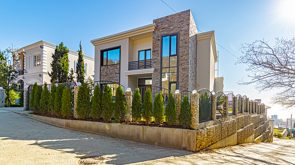 (мраморная крошка и натуральный дикий камень). Кровля плоская, не эксплуатируемая. Остекление: двухкамерные стеклопакеты с поляризационным напылением в алюминиевых рамах «теплого» исполнения. Высота потолков 3 м 60 см.