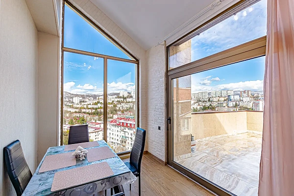 Виды с террасы шикарные на горы и город. Красивы и вечерние панорамы и во время салютов.