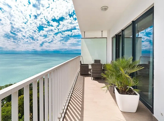 Просторная полноценная двухкомнатная квартира. Большая кухня гостинная и две спальни. Панорамные окна. Вид на море.